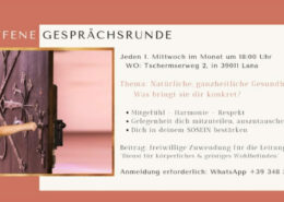 Ich biete Beratung und Begleitung in ganzheitlicher Gesundheit an. Zur Terminvereinbarung reicht ein Anruf. Tel. +39 348 5642361